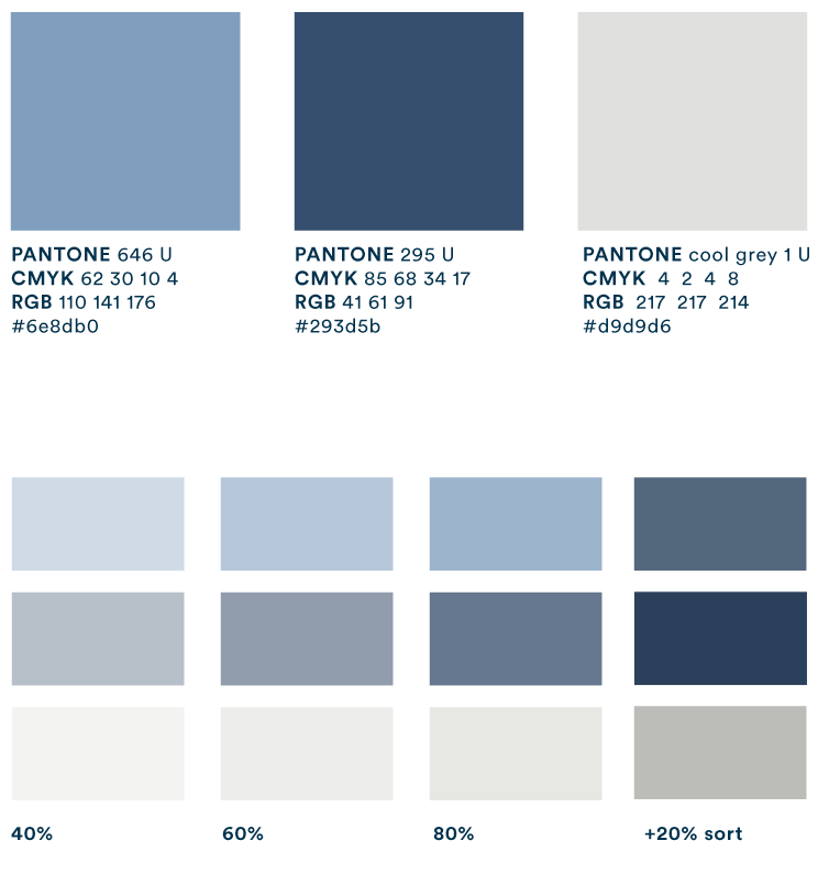 Blå (Pantone 646 U), Mørkeblå (Pantone 295 U) og lys grå (Pantone Cool Grey 1 U).